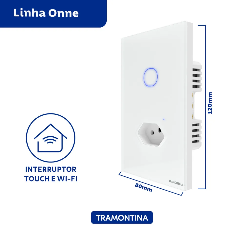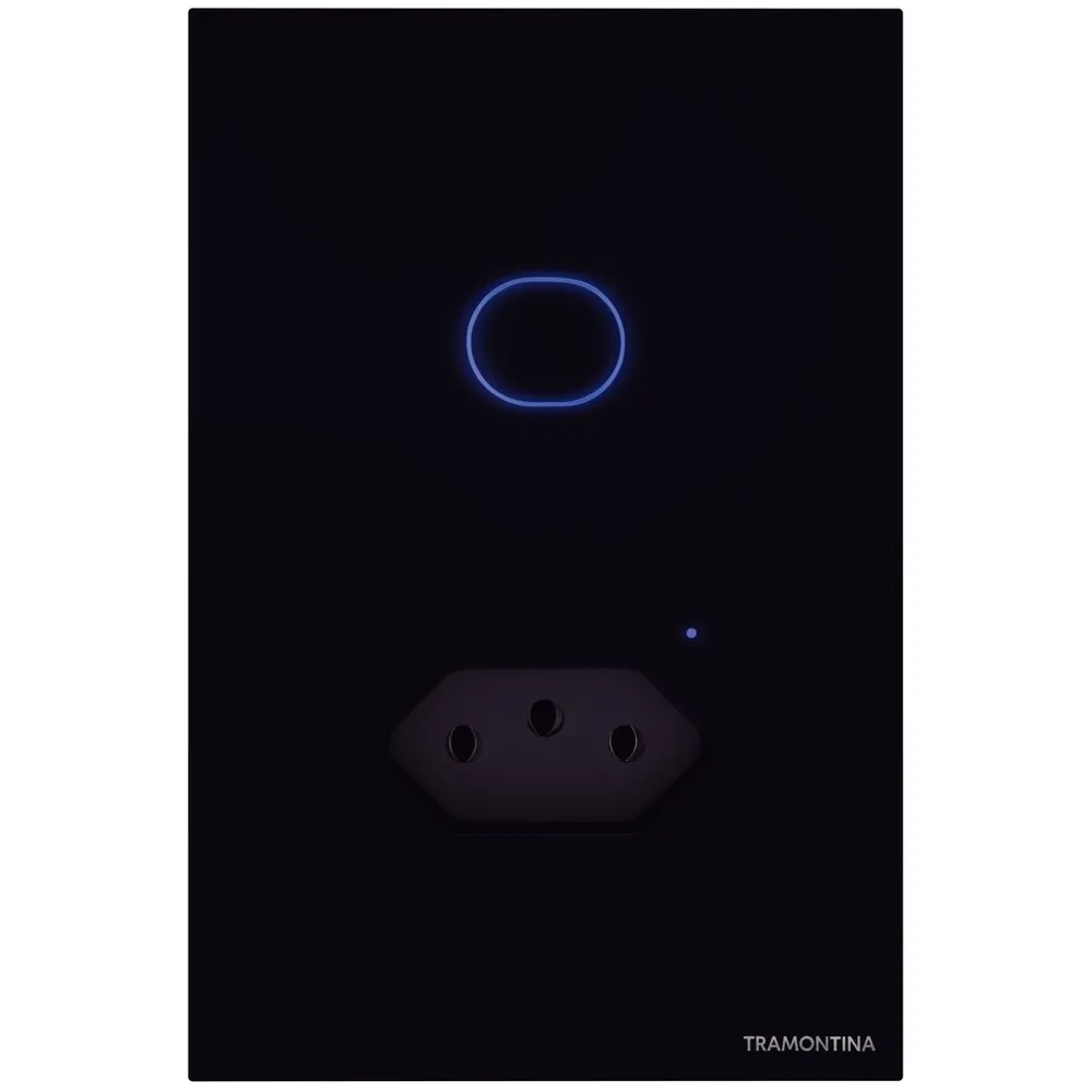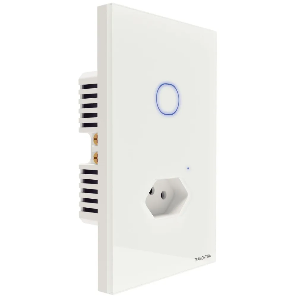 Conhecido como: Interruptor com Wi-Fi e tomada embutida, interruptor de um botão com tomada, desses que funcionam com Alexa, módulo inteligente com botão de luz e uma tomada, tomada com interruptor smart da Tramontina.