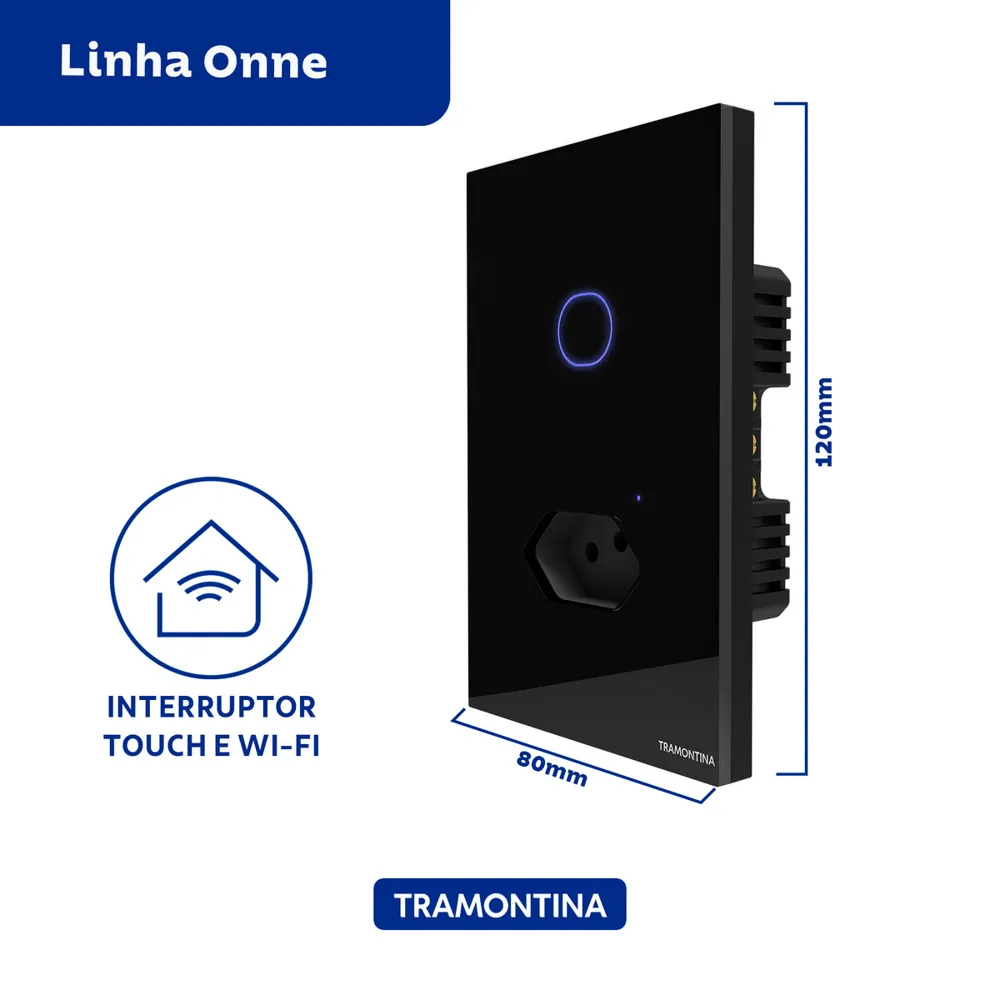 O interruptor Onne touch smart Tramontina preto com 1 canal e 1 tomada 2P+T 10 A 250 V é a escolha ideal para estar sempre conectado e garantir uma casa inteligente.Com ele, você tem o controle total da iluminação e de forma fácil e prática, efetuando comandos por voz, via Alexa e Google Assistente. Ele proporciona a criação de cenas e rotinas inteligentes, que podem ser acionadas por sua localização, de acordo com a previsão do tempo ou mesmo fazer o agendamento para que as luzes liguem ao acordar, deixando seu dia a dia mais agradávelo ou localização.