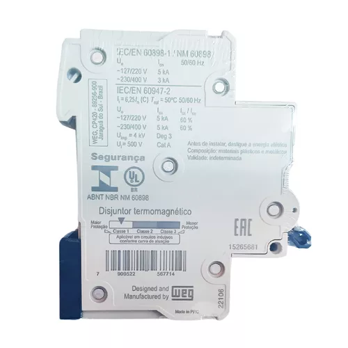 -Conhecido como: Disjuntor weg, disjuntor pequeno, disjuntorzinho de 1 fase, chave de força da weg, disjuntor de luz da weg, disjuntor de um polo, disjuntor para quadro de energia, disjuntor simples, interruptor do quadro de luz, negócio que desarma a luz.
