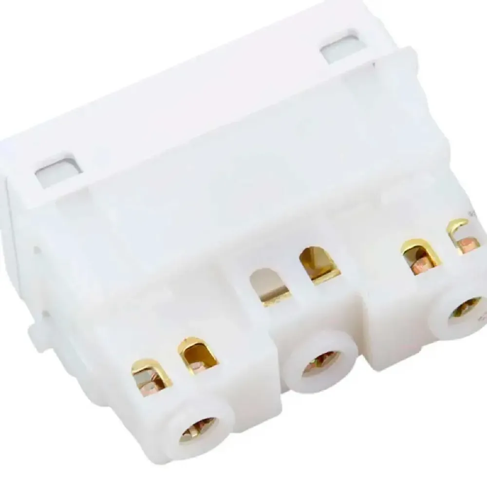 O Módulo Tomada 2P+T Tramontina 10 A 250 V Branco é versátil e muito prático. Produzido em termoplástico antichama, ele possui 2P+T e 10 A, além de apresentar 250 V. Na cor branca, pode ser substituído por outras cores presentes na linha, assim como ser utilizado com outras placas de diferentes linhas da Tramontina. Possui ainda acabamento brilho que não retém poeira. É um modelo largo que garante um contato perfeito com a rede elétrica, já que os condutores elétricos são fixados aos bornes e travados por parafusos. Uma peça prática e essencial para deixar seu projeto ainda melhor e que pode ser pode ser utilizado nas linhas Liz, Lux², Giz, Tablet, Lizflex, Plastibox e conduletes Tramontina com tampa sistema modular.