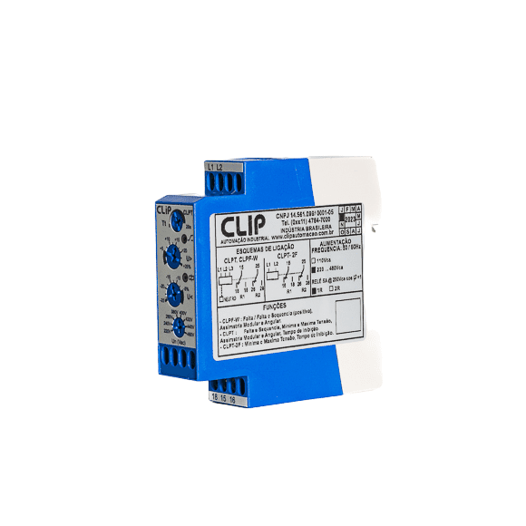 O CLPT é um relé eletrônico projetado para monitorar redes trifásicas entre 220 e 480 VCA. Sua principal função é identificar condições anormais de tensão, como subtensão, sobretensão, falta ou inversão de fase, desabilitando a saída de comando quando ocorre alguma irregularidade. Possui tempo de retardo regulável tanto na energização quanto na detecção de falha, permitindo maior estabilidade em sistemas sujeitos a variações rápidas de energia.É amplamente utilizado na proteção de motores, sistemas de refrigeração, compressores, elevadores e bombas, prevenindo danos e paradas inesperadas.